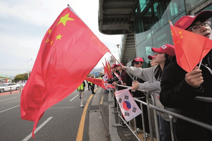 | ▲ ©10월 30일 오전, 시진핑 중국 국가주석이 전용기를 타고 한국에 도착했다. 민중들이 부산 거리에서 양국 국기를 흔들며 시진핑 주석을 환영했다. 사진/시각중국 |